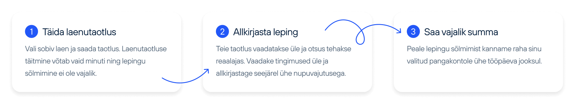 Sinu laenuotsus on personaalne, sõltuvalt sinu valitud laenusummast, lepingu pikkusest ja krediidivõimekusest. Kõik vajalikud tegevused saad ESTO iseteeninduses teha digitaalselt, olgu selleks siis taotlemine, laenugraafiku muutmine või kasvõi ennetähtaegne tagasimaksmine.